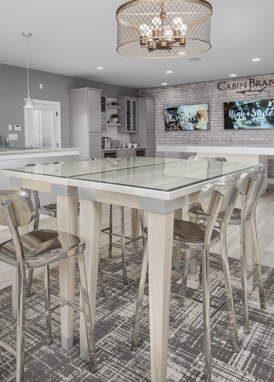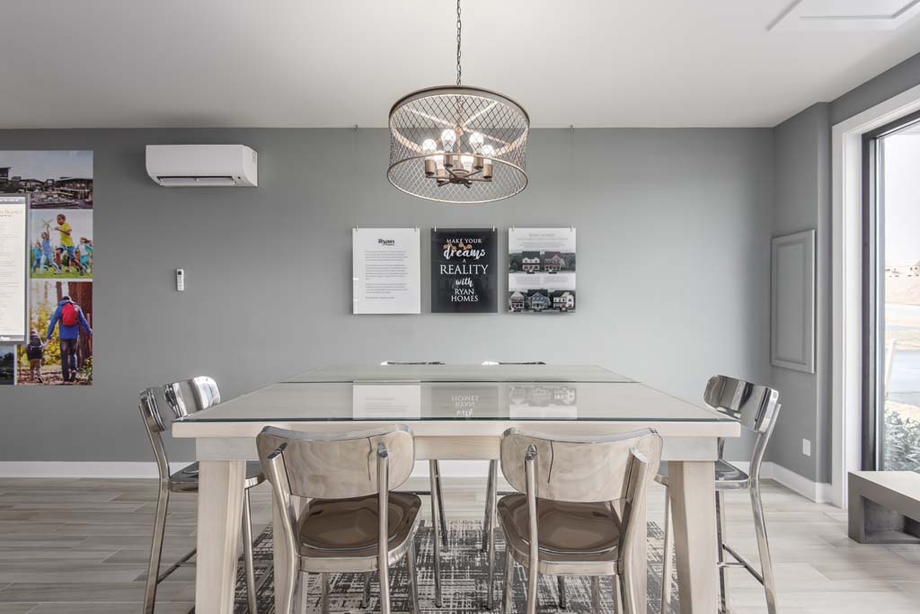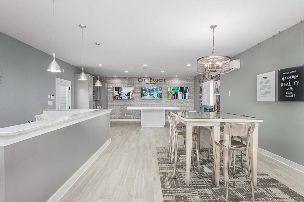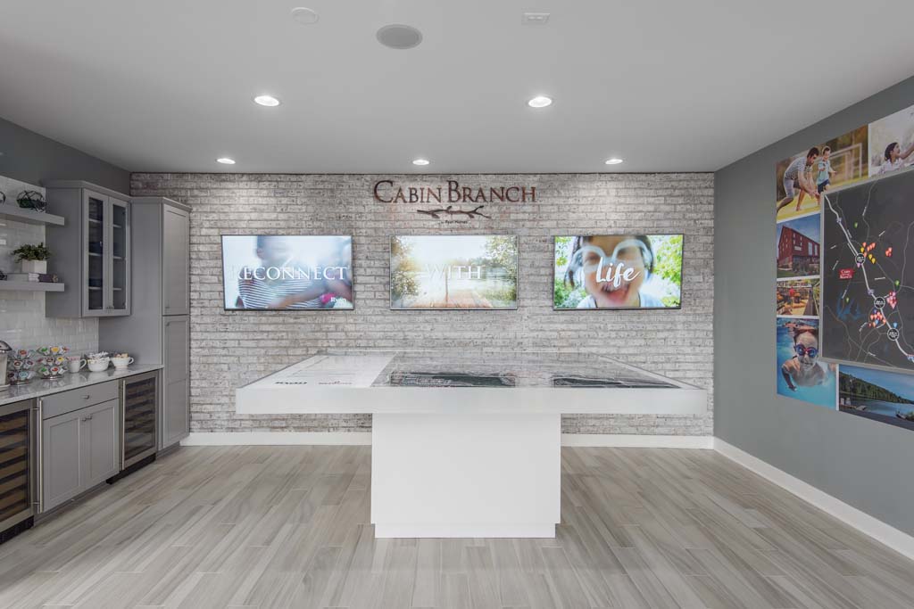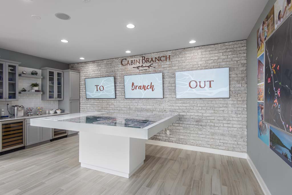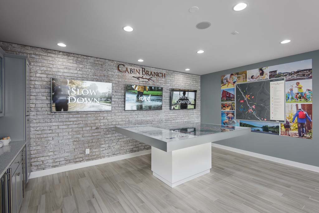 Inspiration was right in front of us, when we were asked by Ryan Homes to design their Sales Center space at Cabin Branch in Clarksburg, Maryland. The designs were branded from the outside, in. With neighboring Clarksburg Town Center, the Cabin Branch Sales Center took on a small shop feel. With kiosk style lighting and floor to ceiling store front style windows setting the tone outside. The warm welcome continued inside in the form of an oversized greeting table and, of course, from the coffee bar. A light-up siteplan table under a tryptic video tells the story of the lifestyle across three screens. As one of our smaller sales center projects, the end result was a design as warm as the interest of the prospects who step inside.