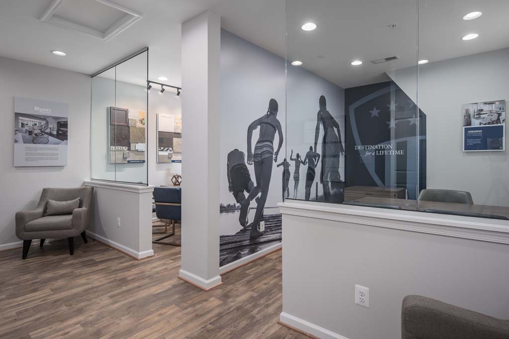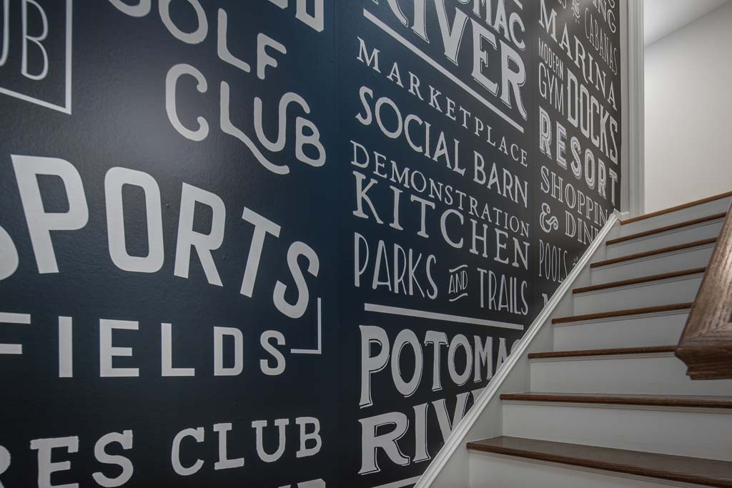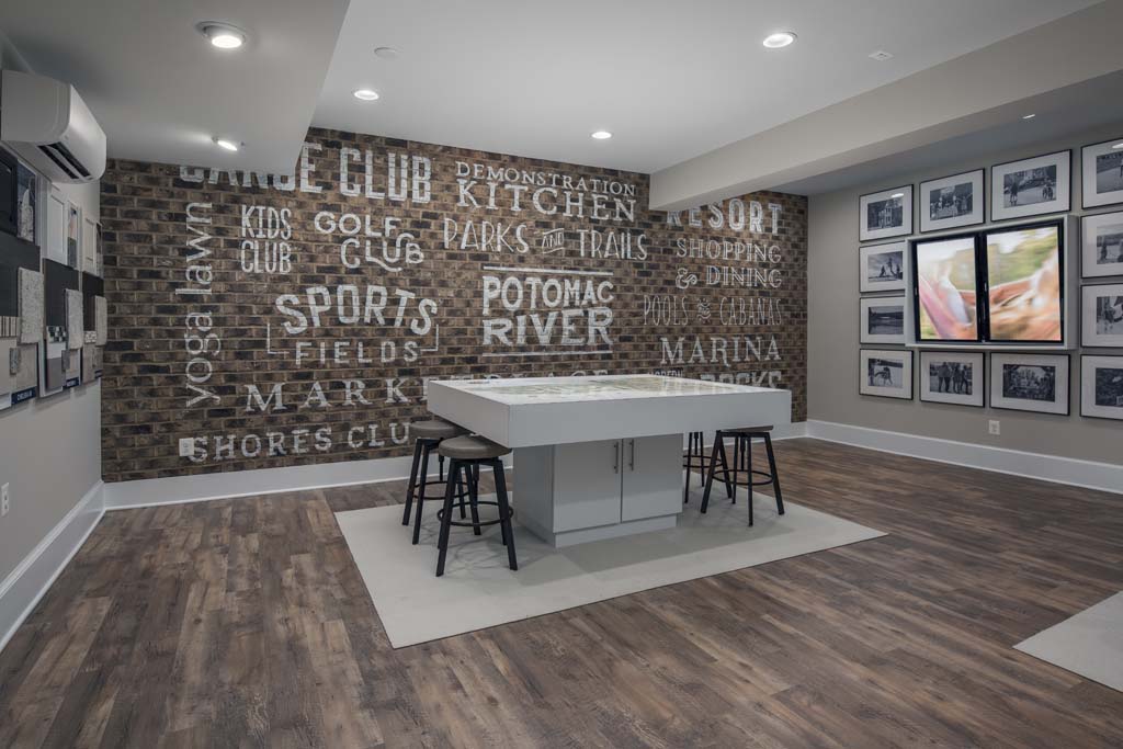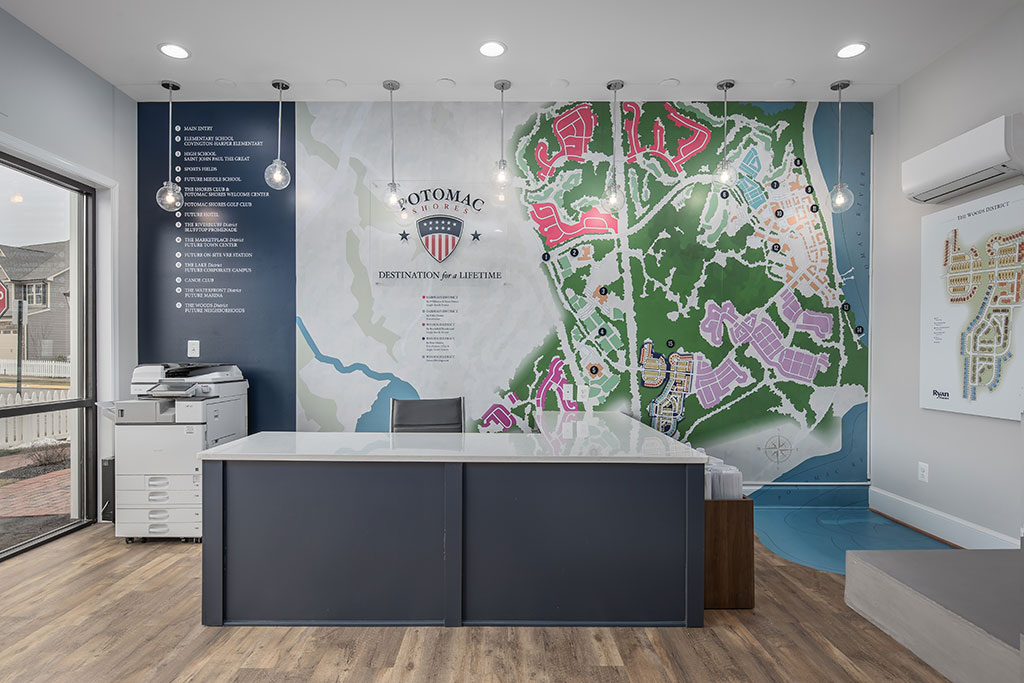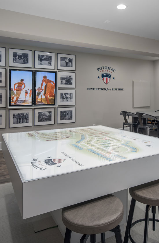 Potomac Shores is a lifestyle and the siteplan alone tells a BIG story. And when one image has so much to say, you give it the best placement to do its job. As a wallpaper, you can’t miss all there is to this award-winning community. With a Jack Nicklaus Signature Design golf course dotting the landscape. Trails winding through. Schools, The Shores Club and neighborhood districts with homes built by the nation’s top builders, Ryan Homes, NVHomes, Brookfield Residential and Pulte Homes. And, just like its namesake, it’s on the shores of something beautiful along the mighty Potomac. An interactive photo display comes to life with a video at the center of it all. A design so unique, we were asked to repurpose it for a smaller townhome sales space, too. An award-winning sales center for an award-winning community.